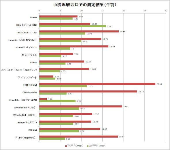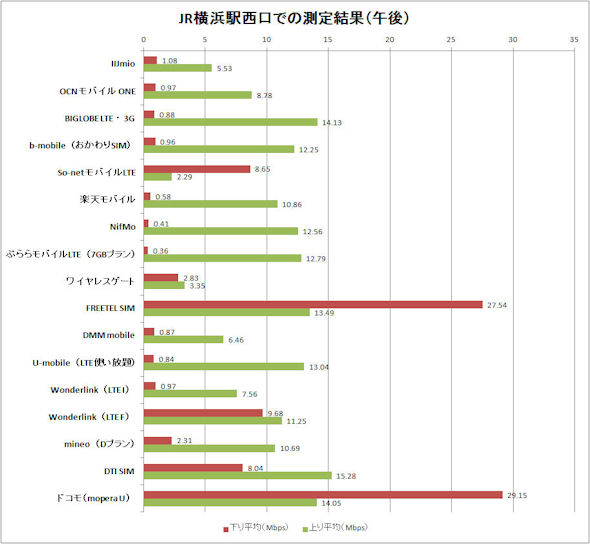 下のグラフはITmediaが公開している格安SIM16事業者17サービスの速度計測結果である。